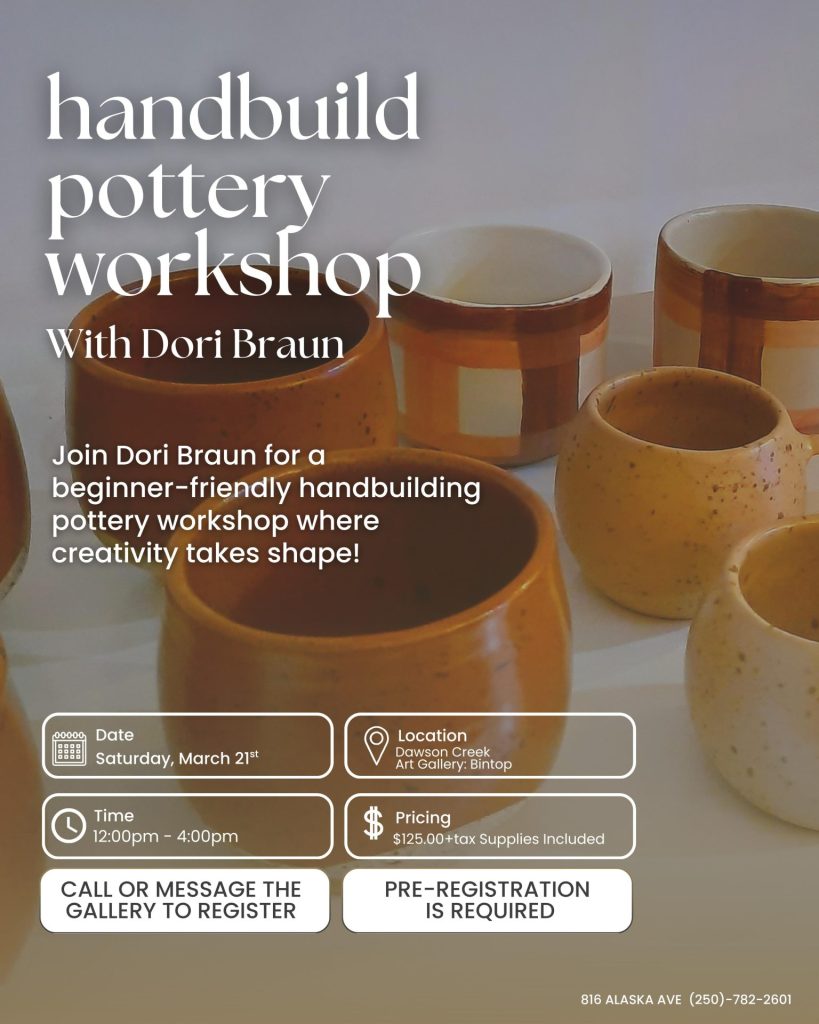 At the Dawson Creek Art Gallery, we strive to offer workshops and courses across a wide range of artistic mediums. Some of our most popular workshops include hand-build pottery, oil painting, acrylics, watercolour, beading, block printing, and more. Pricing varies depending on the medium and the length of each class.