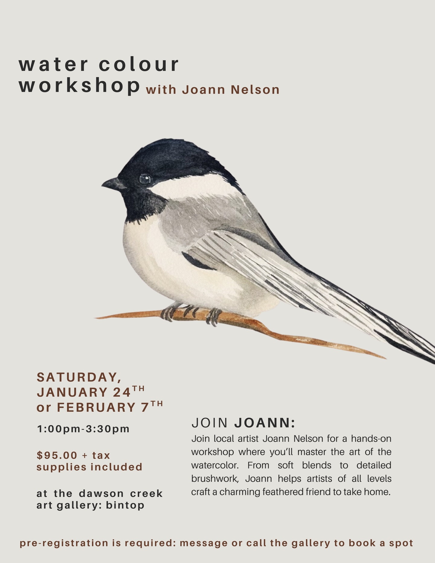 At the Dawson Creek Art Gallery, we strive to offer workshops and courses across a wide range of artistic mediums. Some of our most popular workshops include hand-built pottery, oil painting, acrylics, watercolour, beading, block printing, and more. Pricing varies depending on the medium and the length of each class.